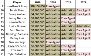 While the guarantees feature much of the Brewers core, the team’s arbitration-eligible players include numerous contributors, a couple of them essential to the team’s renaissance. Here are their arbitration projections (salary projections by MLBTR and Matt Swartz):