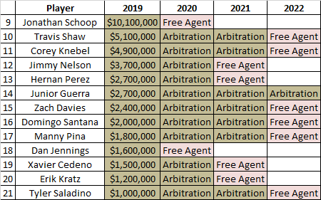 The remaining commitments are all quite safe as the team has only $1.5 million guaranteed beyond 2019 for Thames, Chacin, Anderson, Jeffress, and Albers combined. Thames, Anderson, and Jeffress are all controllable further via bargain-rate club options.