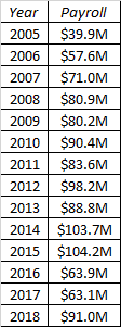 2016-17 stick out for the opposite reason as spending cratered while Stearns rebuilt the franchise. When the club showed significant (and somewhat unexpected) progress in 2017, Attanasio OK’d a return to something close to pre-rebuild spending levels.