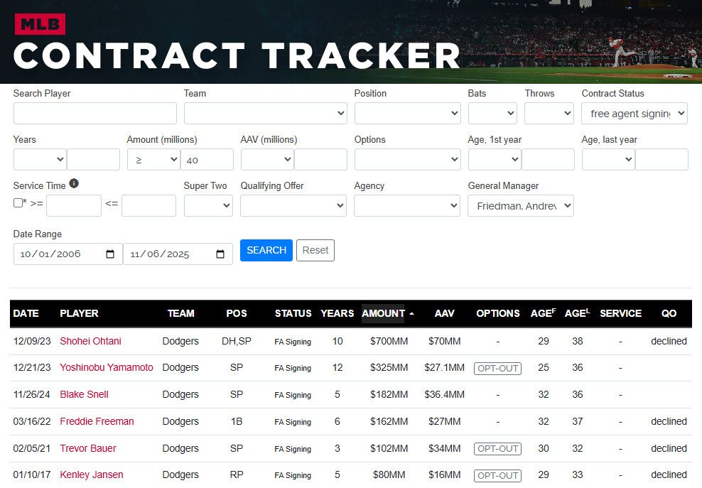 You can filter by player name, team, position, batting handedness, throwing handedness, contract type (MLB deal, minor league deal, extension), number of years, amount of total money, average annual value, type of option, age in the first year of the deal, age in the last year of the deal, service time for those who signed extensions, Super Two status, qualifying offer status, agency at the time of signing, GM at the time of the signing, and any date range from 10-1-06 to present.